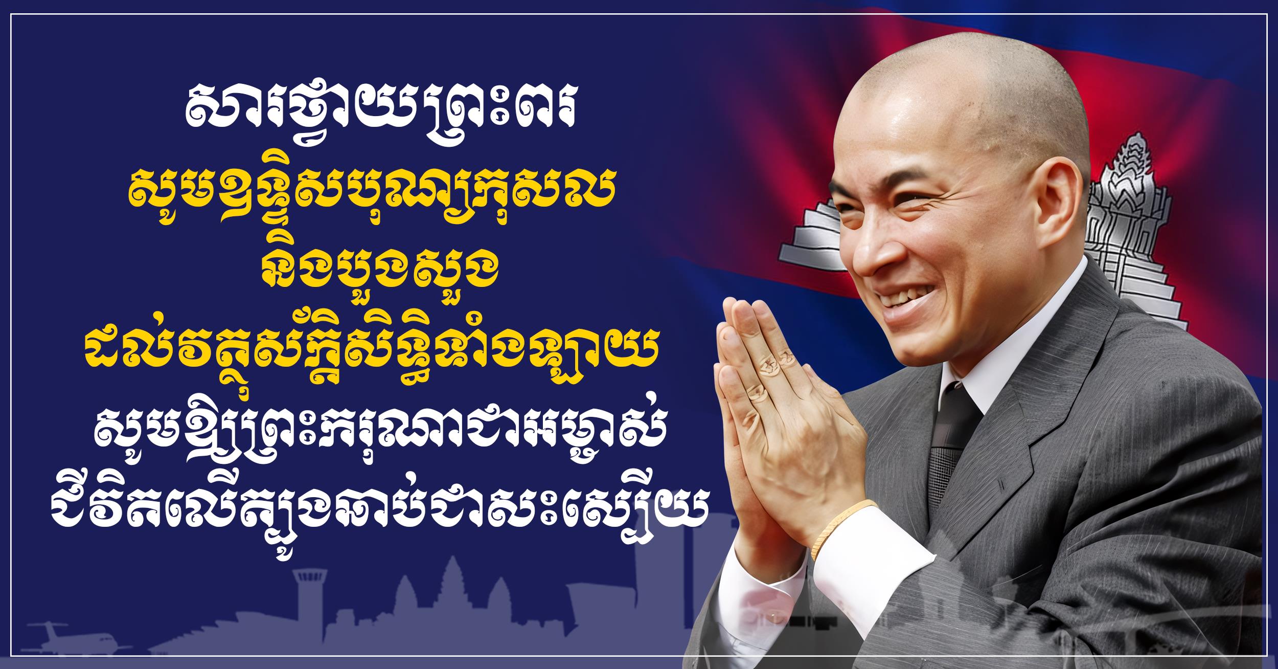 ទូលព្រះបង្គំជាខ្ញុំទាំងអស់គ្នា សូមលើកហត្ថប្រណមបួងសួងដល់គុណបុណ្យព្រះរតនត្រ័យកែវទាំងបី វត្ថុស័ក្តិសិទ្ធិទាំងឡាយក្នុងលោក ទេវតារក្សាព្រះមហាស្វេតច្ឆត្រ ព្រះបារមីអតីតព្រះមហាវីរក្សត្រ ព្រះមហាក្សត្រ ព្រះមហាក្សត្រិយានីគ្រប់ព្រះអង្គ ជាទីគោរពសក្ការៈ សូមព្រះរាជមេត្តាអភិបាលថែរក្សា ព្រះករុណា ជាអម្ចាស់ជីវិត លើត្បូងជាទីគោរពសក្ការៈដ៏ខ្ពង់ខ្ពស់បំផុត ឆាប់បានជាសះស្បើយពីព្រះរោគ ព្រមទាំងមានព្រះរាជសុខភាពល្អ បរិបូរ កម្លាំងពលំមាំមួន ដើម្បីយាងនិវត្តន៍បន្តគង់ប្រថាប់ ក្នុងព្រះបរមរាជសម្បត្តិ ជាម្លប់ដ៏ត្រជាក់ត្រជុំរបស់មាតុភូមិកម្ពុជា និងប្រជានុរាស្ត្រខ្មែរគ្រប់រូបនៅទូទាំងព្រះរាជាណាចក្រកម្ពុជា ជាដរាបតរៀងទៅ។