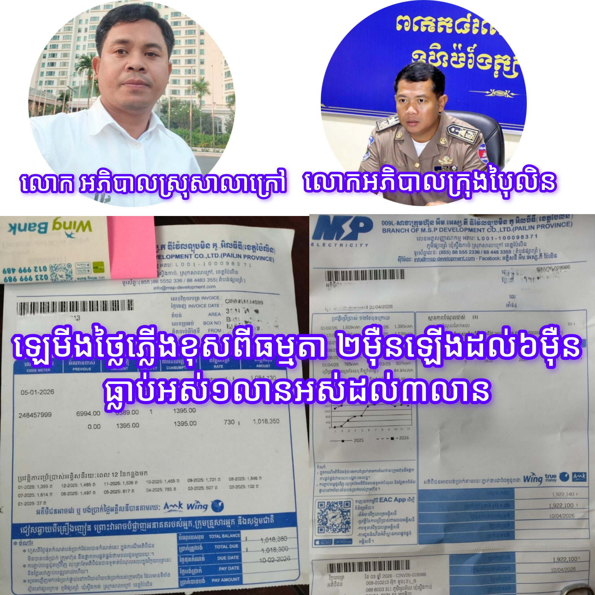 ប៉ៃលិន៖ នៅរសៀលថ្ងៃសុក្រ ទី១០ ខែមេសា ឆ្នាំ២០២៦ ត្រូវនឹងថ្ងៃទី៨រោច ខែចេត្រ ឆ្នាំម្សាញ់ ពុទ្ធសករាជ ២៥៦៩ ប្រជាពលរដ្ឋរស់នៅក្នុងខេត្តប៉ៃលិន ជាពិសេសនៅក្រុងប៉ៃលិន បានបង្ហាញការព្រួយបារម្ភយ៉ាងខ្លាំង ចំពោះបញ្ហាតម្លៃសេវាអគ្គិសនី ដែលកំពុងកើនឡើងខុសប្រក្រតីក្នុងរយៈពេលចុងក្រោយនេះ។